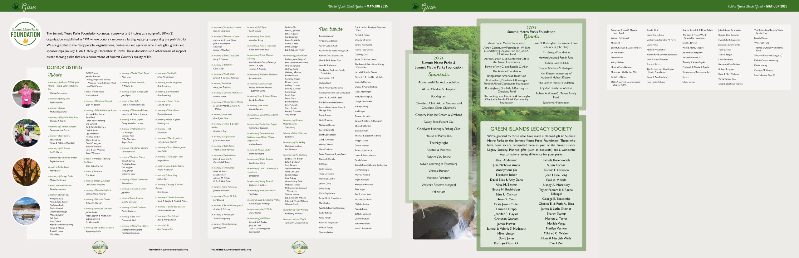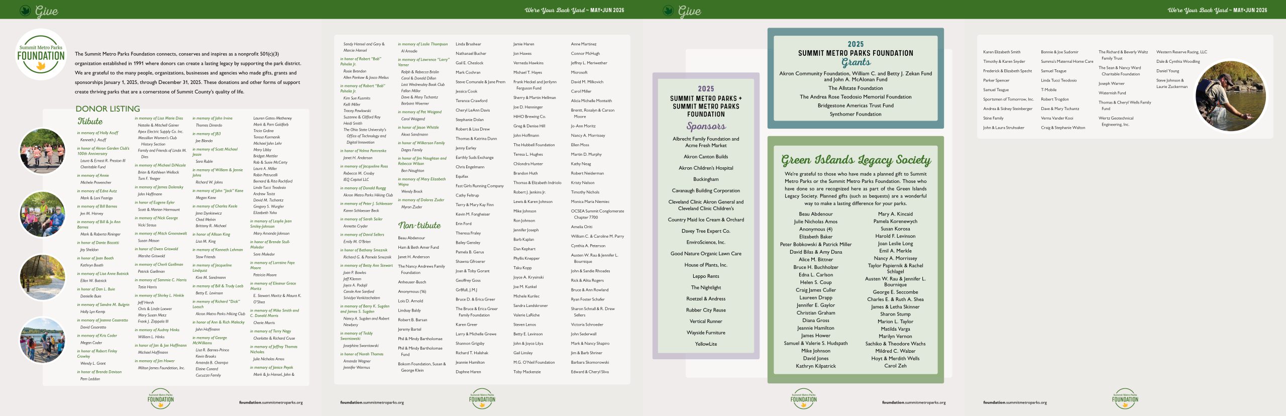 We are grateful to the many people, organizations, businesses, and agencies who made gifts, grants, and sponsorships January 1 through December 31 of each year. These donations and other forms of support create thriving parks that are a cornerstone of Summit County’s quality of life and benefit the park’s district charitable, educational and scientific initiatives. Members of the Green Islands Legacy Society—those who have made or documented a planned gift—are recognized every year.